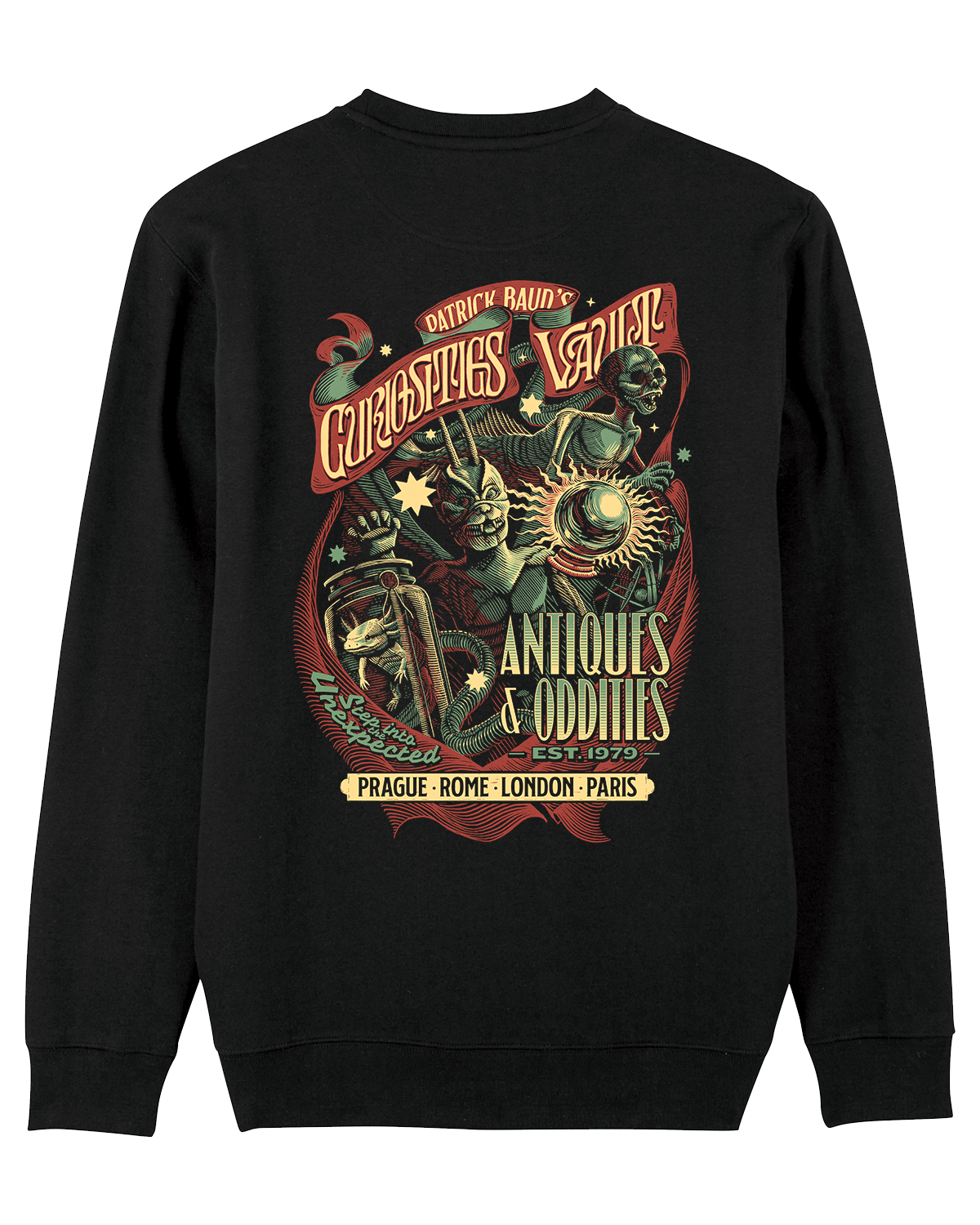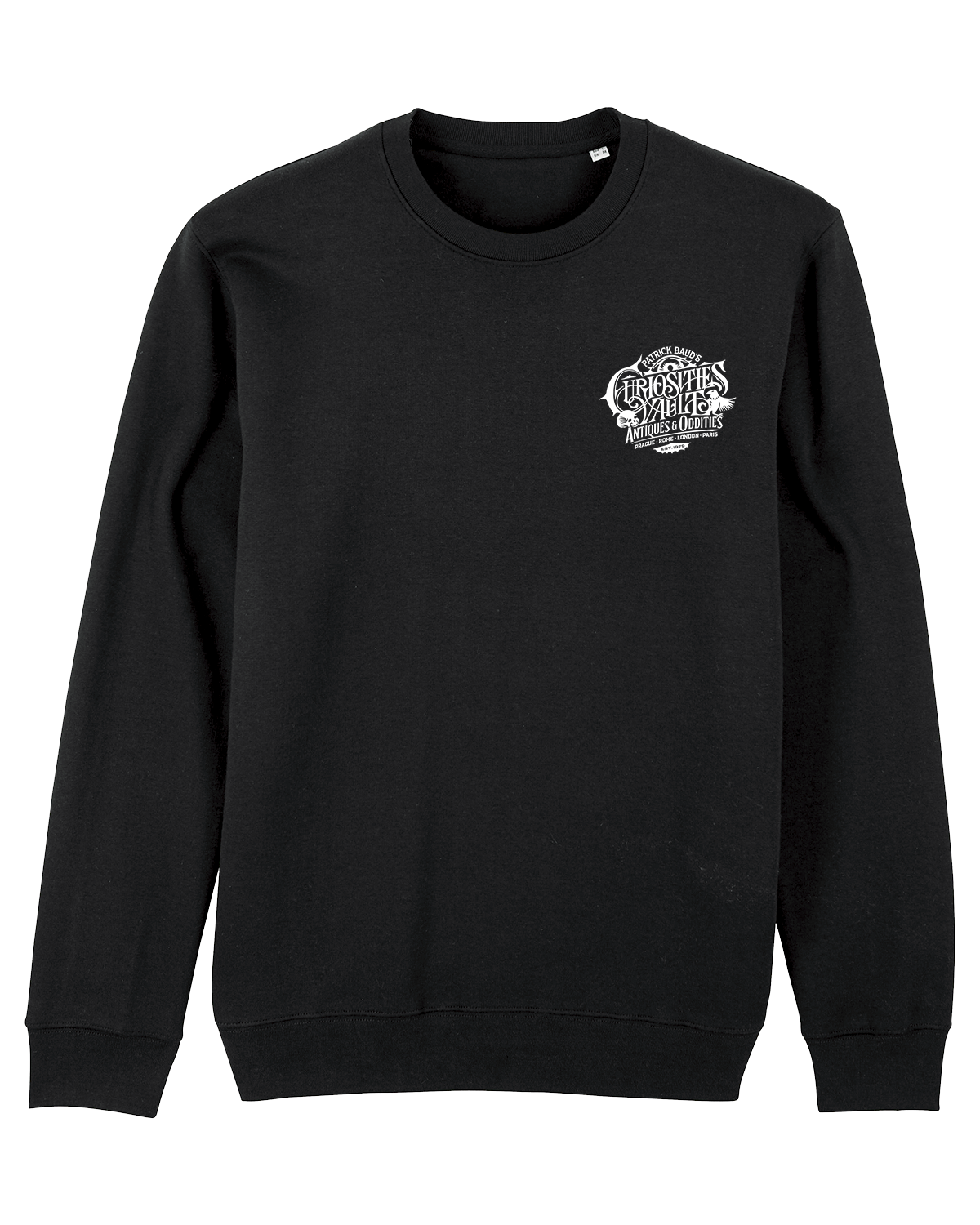 Le visuel, réalisé par le studio Vaderetro, est ici sérigraphié sur le coeur et dans le dos d'un sweat col rond noir unisexe en coton 100% biologique !