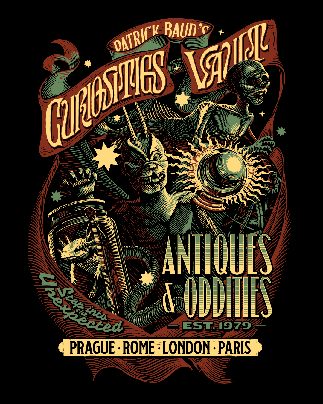 Alors une fois de plus, j'ai demandé aux fabuleux artistes de Vaderetro de m'aider à concrétiser cette vision, deux ans après la collection "Hic Sunt Dracones". Ensemble, nous avons imaginé à quoi ressembleraient les produits derivés de ce "Curiosities Vault".