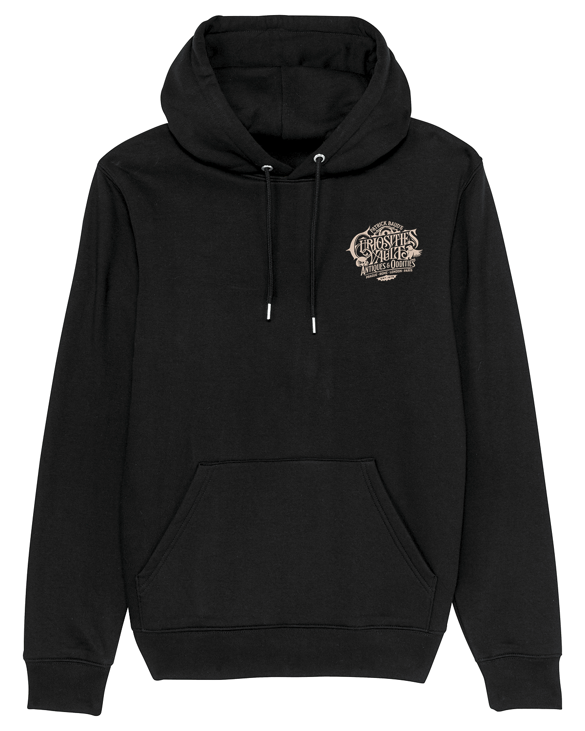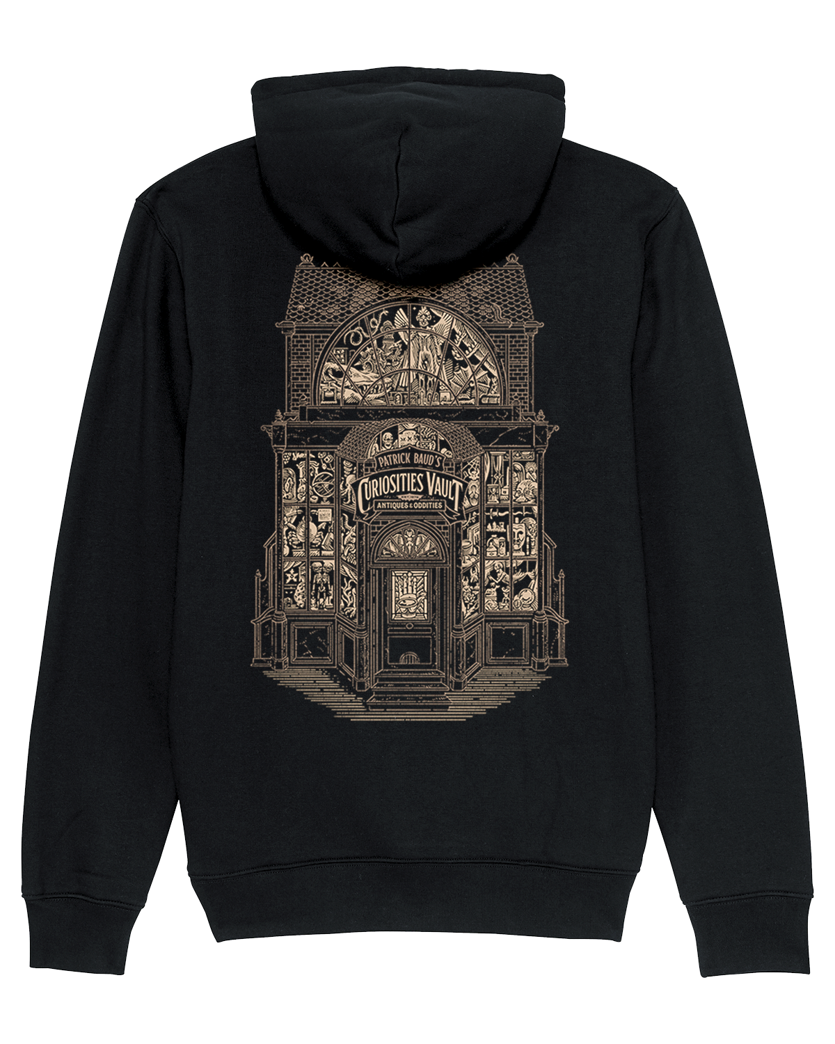 Le visuel, réalisé par le studio Vaderetro, est ici sérigraphié sur le coeur et dans le dos d'un sweat à capuche noir unisexe en coton 100% biologique !