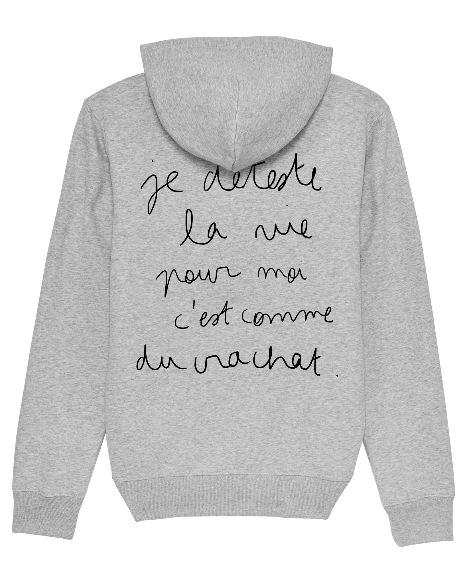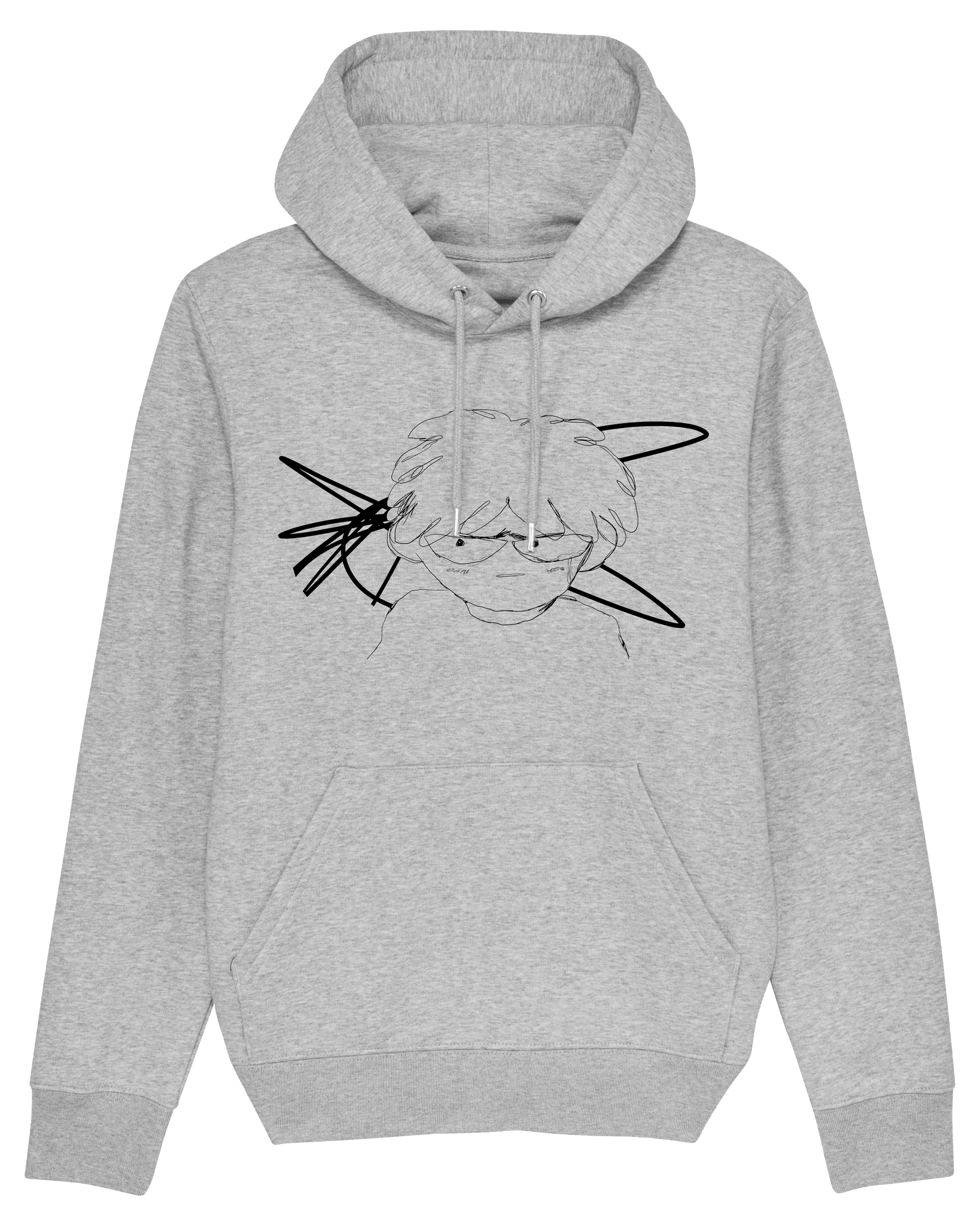 Emilie Tronche's design is screen-printed on the front and back of a unisex grey hoodie made from 100% organic cotton!